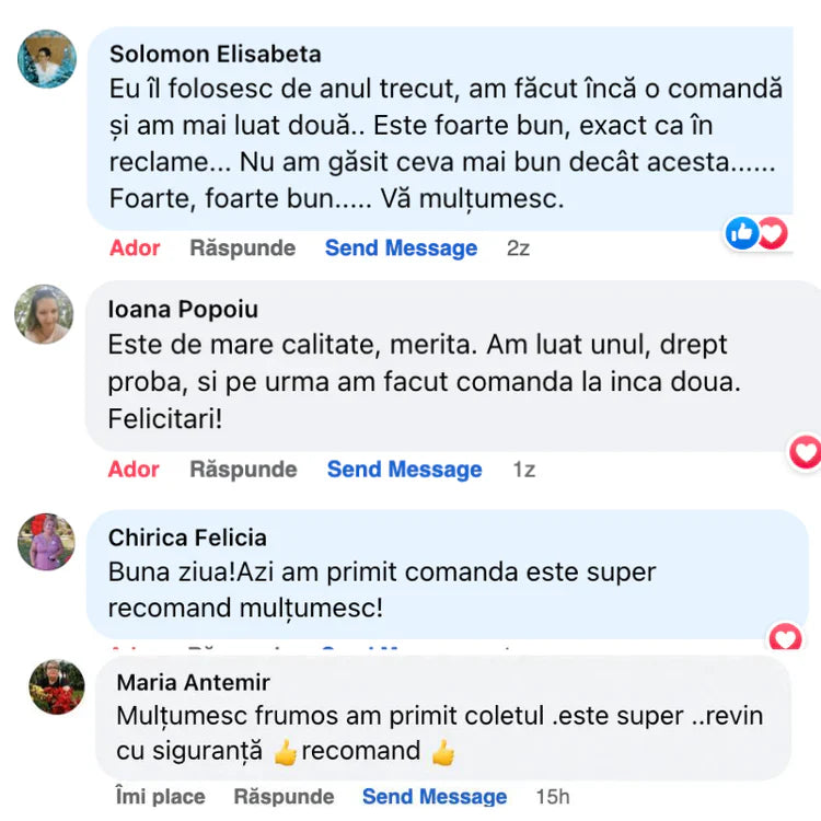 Suntem atât de încrezători în produsele noastre încât, dacă nu ești mulțumit(ă), îți primești banii înapoi garantat, fără alte întrebări.